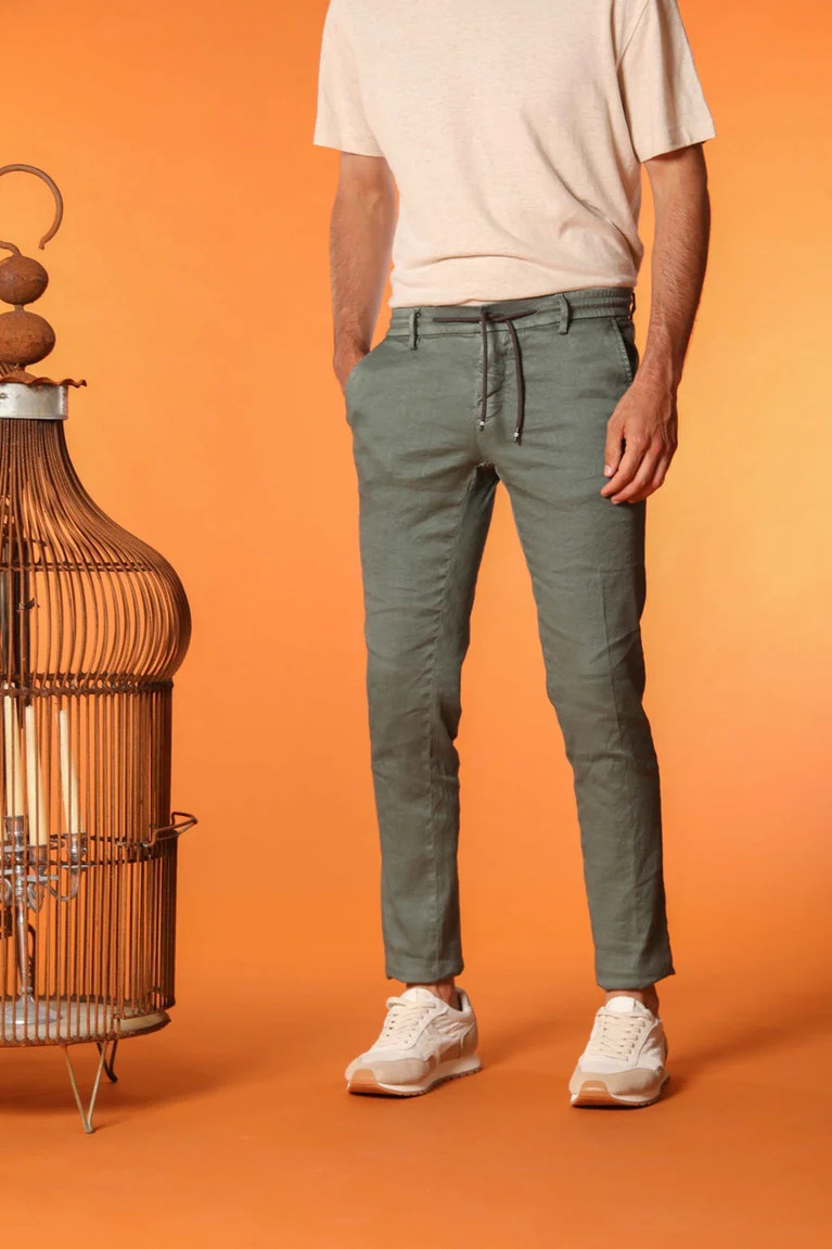 Men's Green Cotton and Linen Twill Elastic Waist Slim Fit Trousers 496539