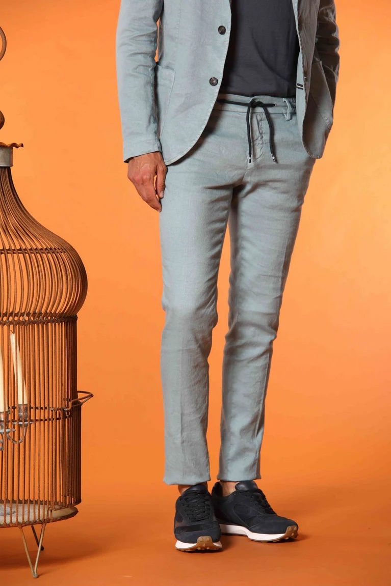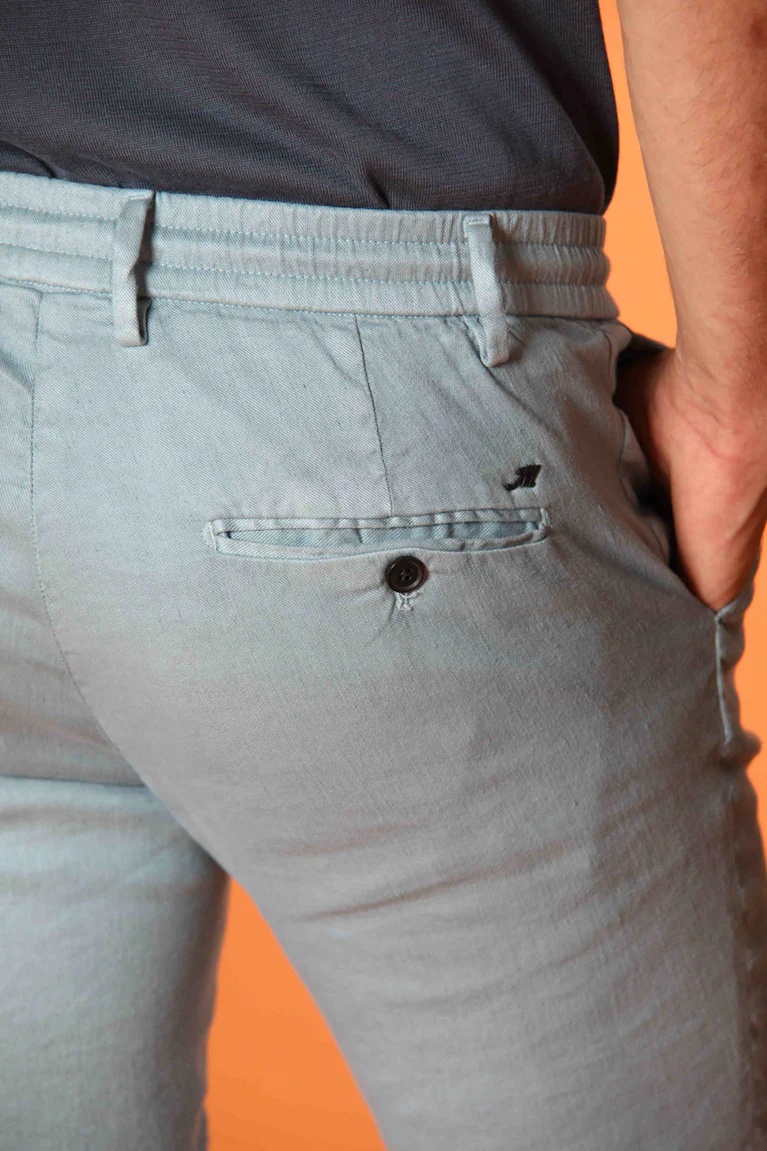 Men's Sky Blue Cotton and Linen Twill Elastic Waist Slim Fit Trousers 497362